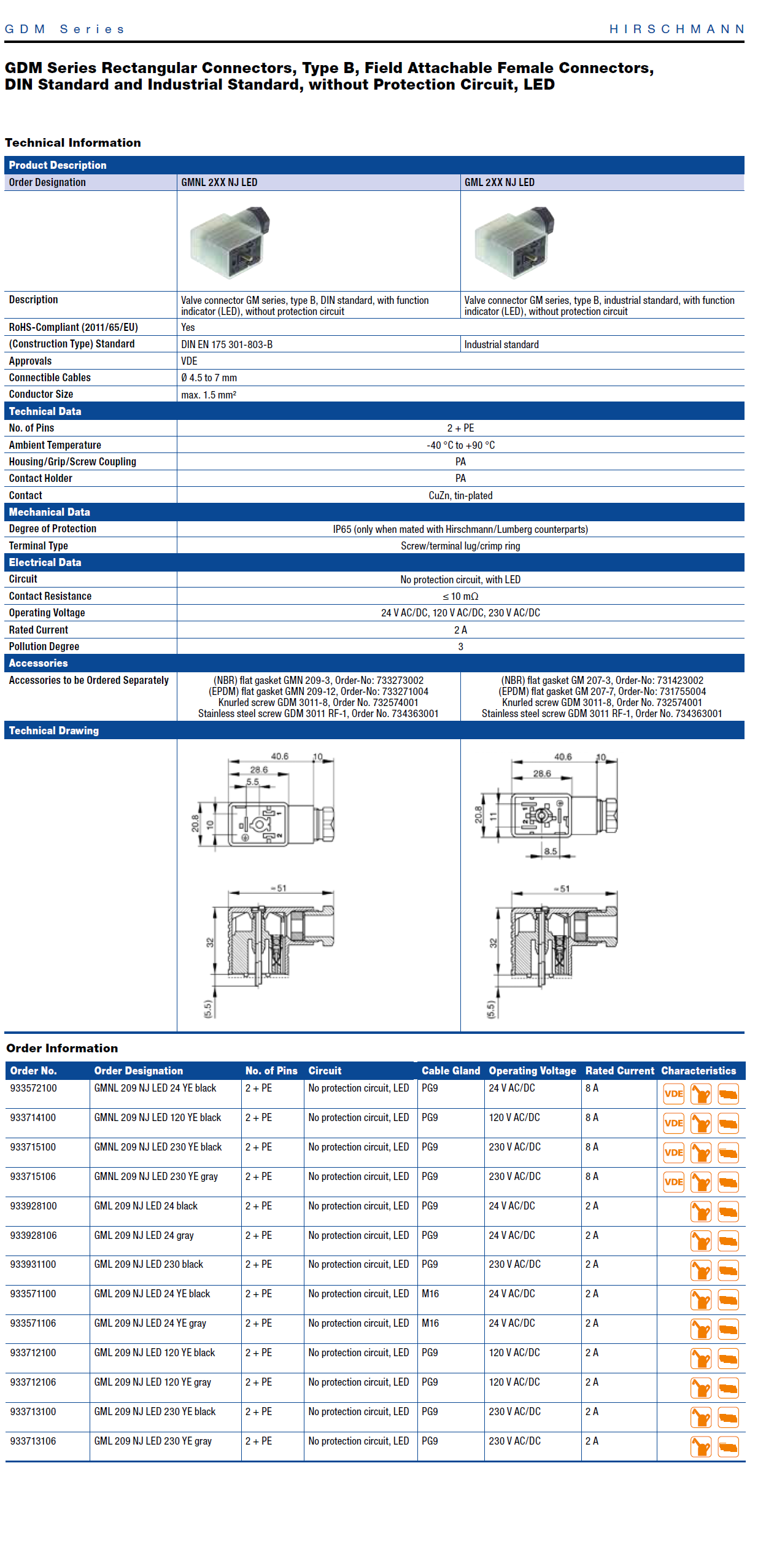 GML 2XX NJ LED: Valve connector GM series, type B, industrial standard, with function indicator (LED), without protection circuit, Industrial standard