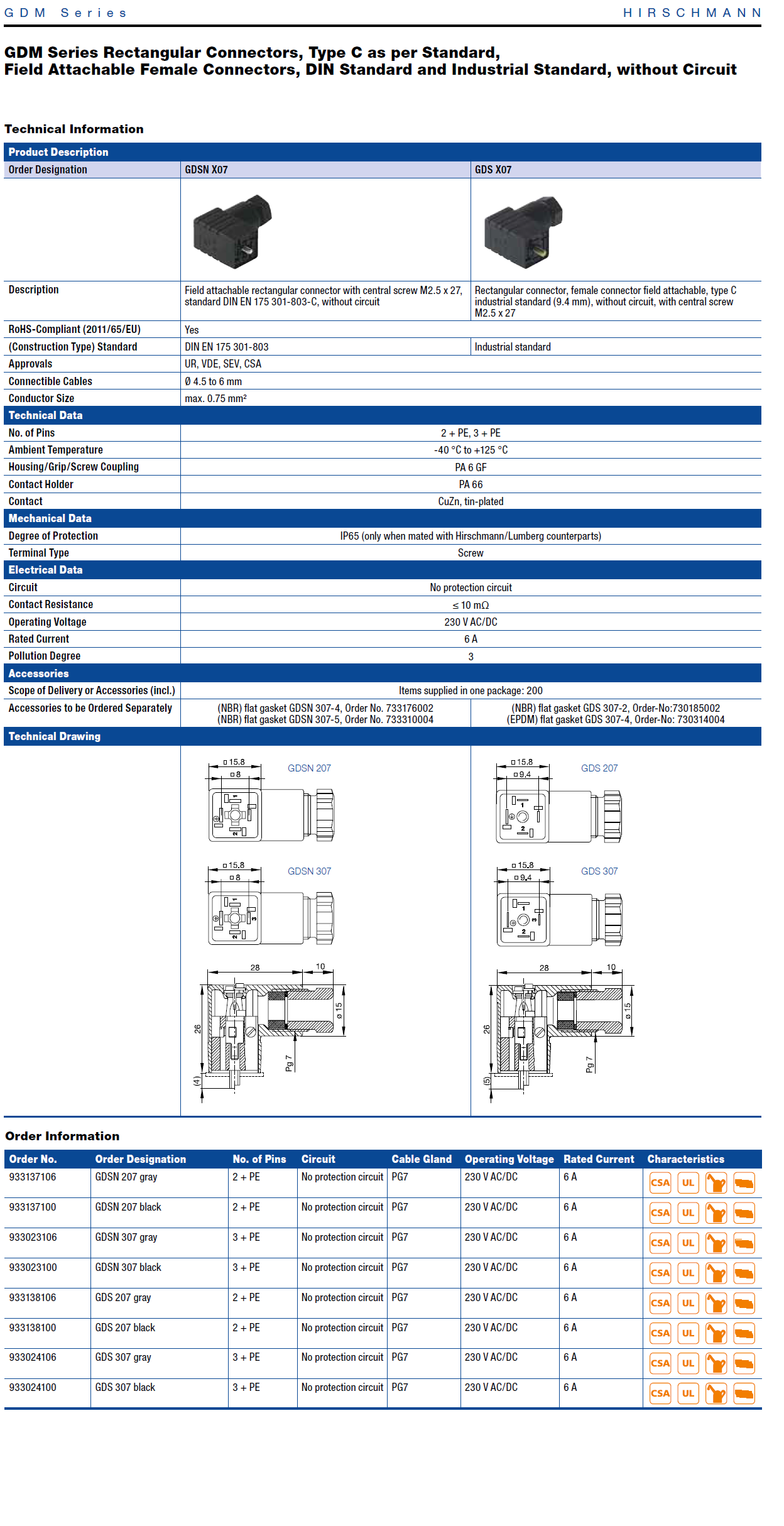 GDSNL 207 LED 230 VR YE black GM Industrial Standard Field Attachable Connector: Form C, 3-pin (2+1PE; PE across cable outlet), translucent housing, screw type, PG7; with varistor and yellow LED, 230 V AC/DC, 6 A