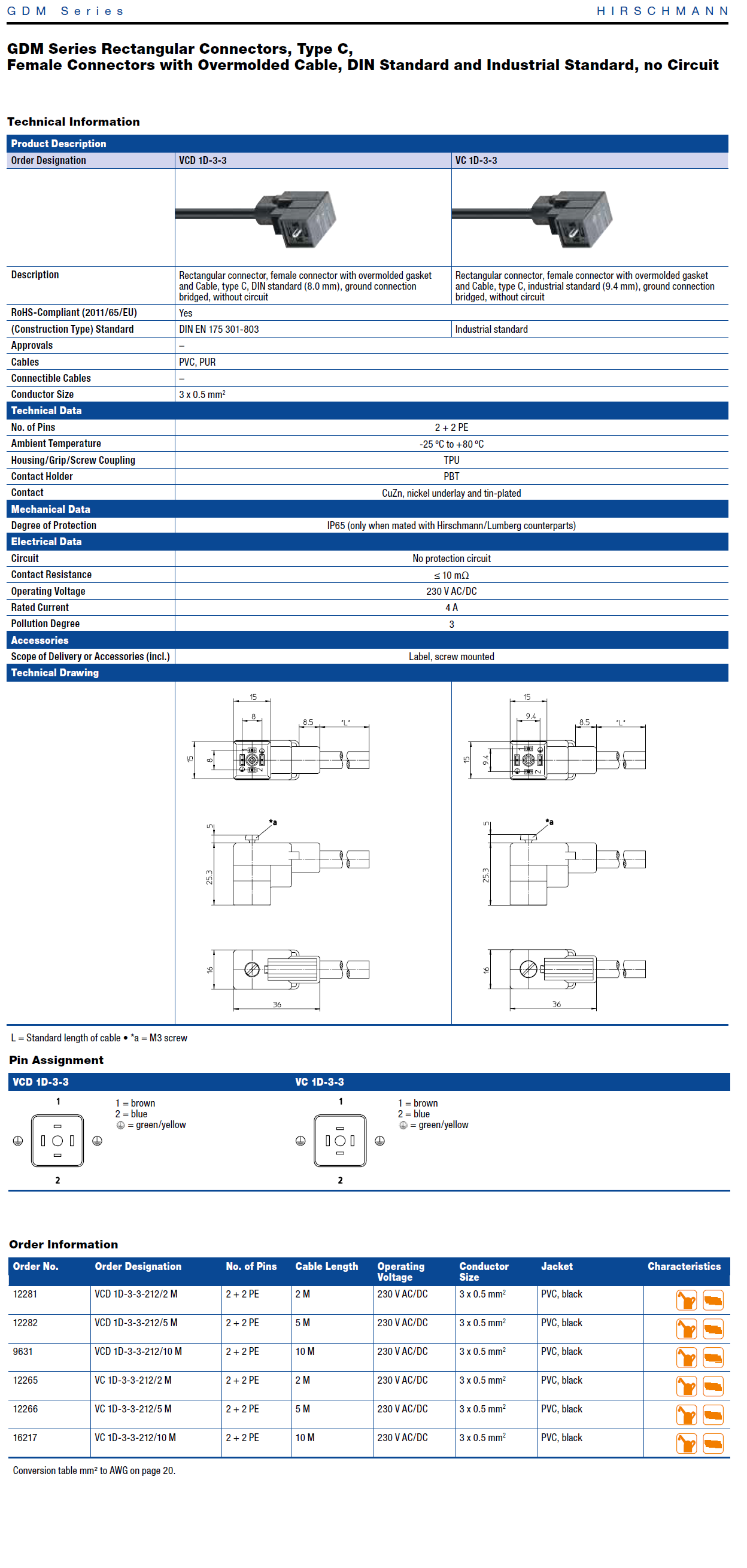 GDM Series Rectangular Connectors, Type C, Female Connectors with Overmolded Cable, DIN Standard and Industrial Standard, no Circuit