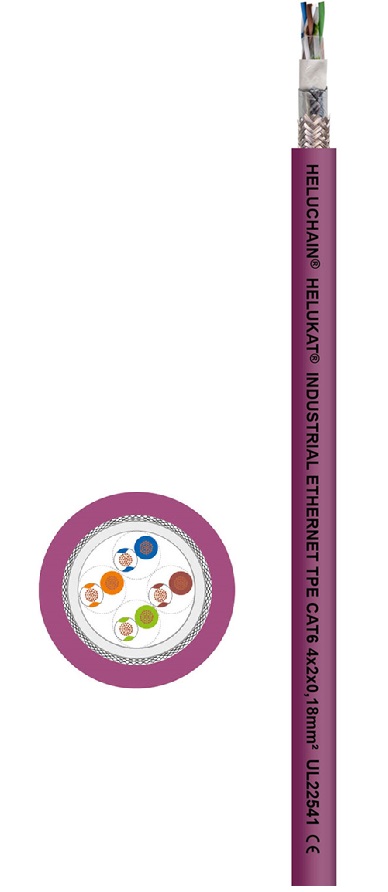 The HELUCHAIN® HELUKAT® 250S CAT.6 SF/UTP TPE features an additional inner sheath for applications with long travel distances and the highest requirements for acceleration, abrasion resistance, and minimum bending radii. Has an extended functional temperature range while moving of -35°C to +90°C.