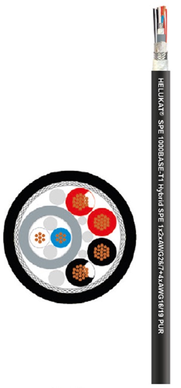HELUKAT SPE B 1000BASE-T1 HYBRID is intended for flexible applications or for permanent installation and is exceptionally oil resistant due to its PUR sheathing. This cable is intended for use with SPE hybrid plugs acc. to IEC 63171 Type II.