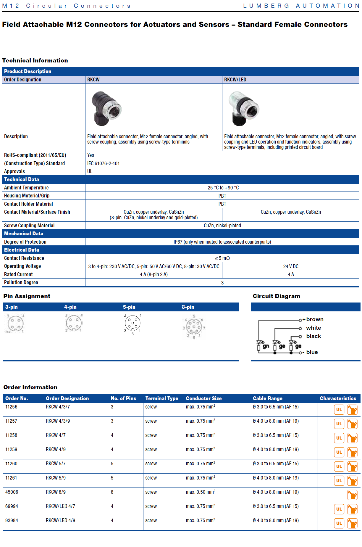 RSCW Field attachable connector, M12 male right angle connector, 3-, 4-, 5-, and 8-pole with threaded joint, assembling with screw terminals.