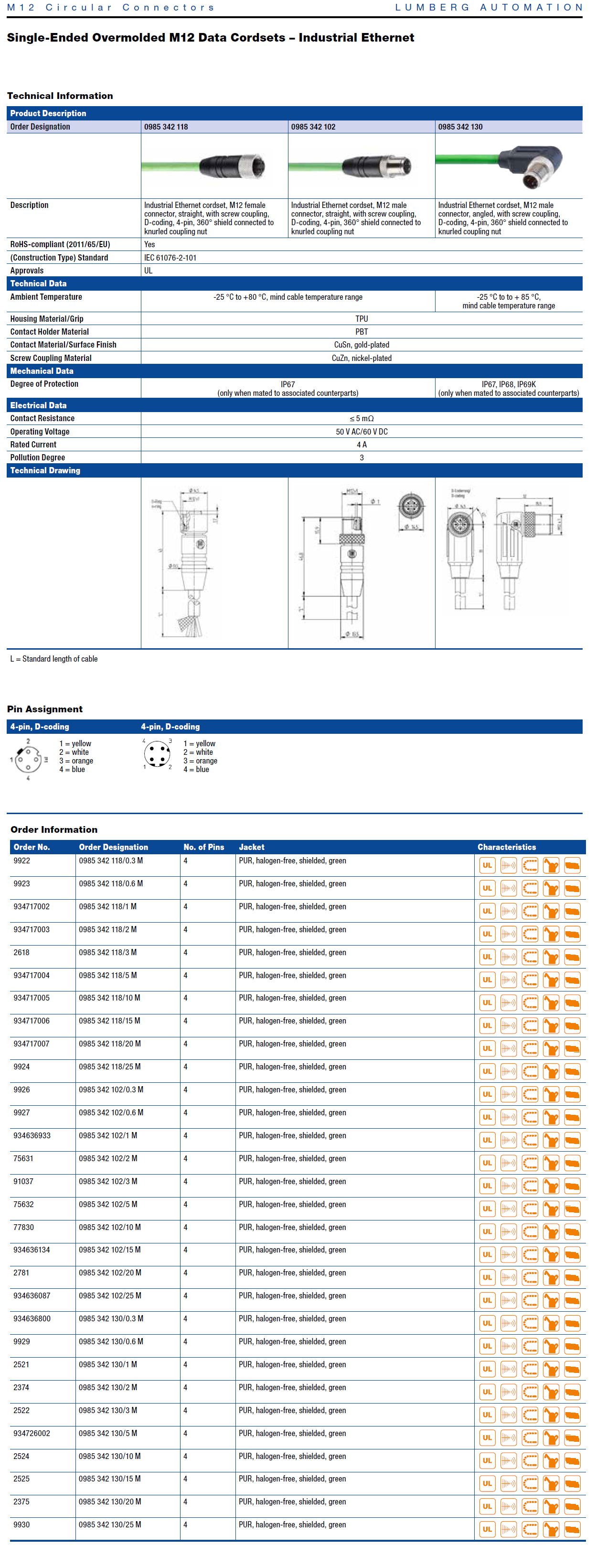 0985 342 130 – Fast Ethernet Cat5e Data Single-Ended Cordset: M12 Standard, male, angled, 4-pin, D-coded, shielded, black body, 50 V AC / 60 V DC, 4 A; PUR green cable, 4-wires, 2x2x0.34 mm²