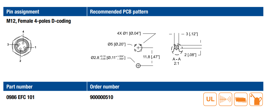 0986 EFC 101 Industrial Ethernet Receptacle Connectors for PROFINET or Ethernet/IP Applications Receptacle connector, M12 female connector, 4-pole, D-coding, PCB contacts with board lock, chassis side thread PG 9