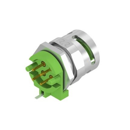 43-03921 SAL – MB12D – FKH4 – X5,5 M12x1 D-coded female axial 4 pos. back panel mounting, panel thickness 2,2 mm, bayonet/screwable locking, solder pin straight h=5,5mm