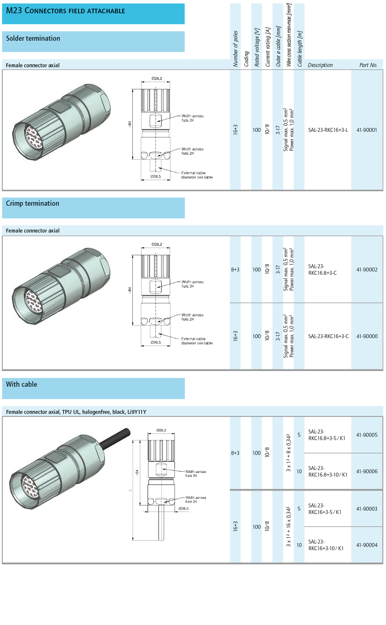 41-90001 SAL-23-RKC16+3-L M23 field attachable female axial 16P+3P, solder cup termination