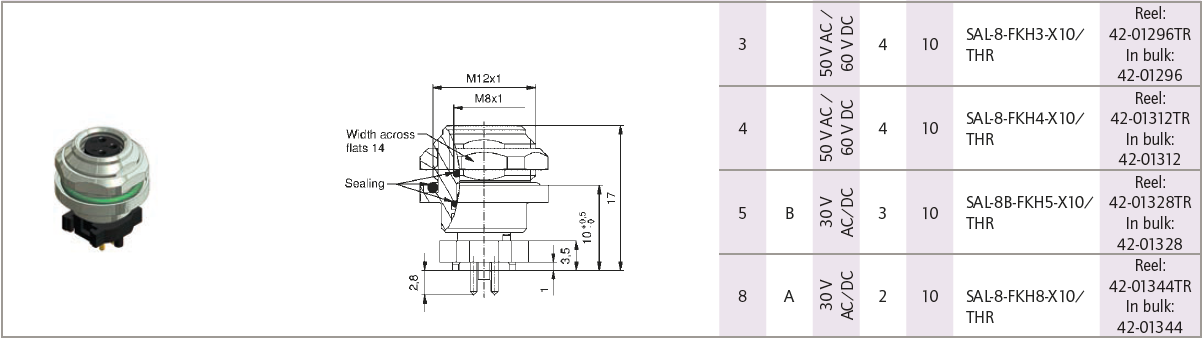 42-01328 SAL-8B-FKH5-X10/THR M8 B-coded female axial back panel mounting 5 pos. THR, unshielded, h=10mm, 30 V AC / 30 V DC, 3A