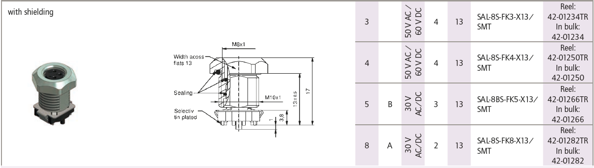 42-01250 SAL-8S-FK4-X13/SMT M8 A-coded female axial front panel mounting 4 pos. SMT, with shielding, h=13mm, 50 V AC / 60 V DC, 4A