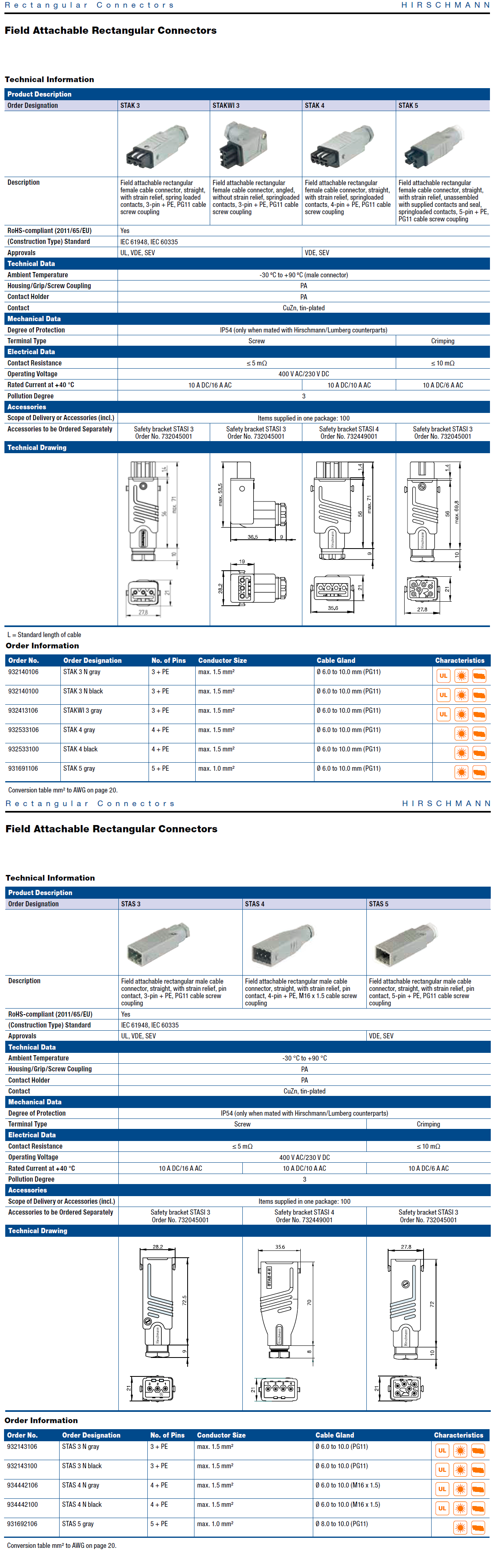 STAS 5 V0 – Rectangular Field Attachable Power Connector (ST Series): Male, straight with strain relief , 5-pin+PE, grey housing, 400 V AC/230 V DC, 10 A AC/6 A DC